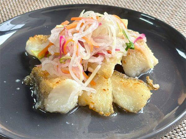 大根サラダの色味がきれいで、料理が映えますね。それではいただきます。塩たらの表面はカリカリで、中はプリプリです。今回フルーツ酢ではなく米酢を使いましたが、酸味はマイルドで、塩や砂糖もやさしい味付けになっていて大根サラダともマッチしています。シャキシャキとした大根サラダの食感がアクセントになって、とってもおいしいです。全体的にさっぱりとしていて好みの味ですね。