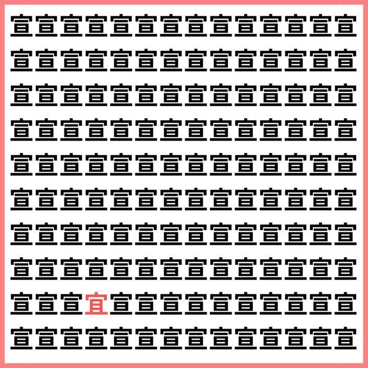 たくさんの「宣」の中に、1文字だけ違う漢字が混ざっています。