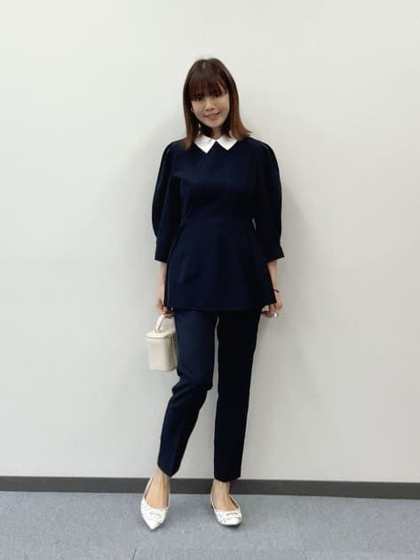 センタープレス入りの美脚パンツが視線を縦に流して、スラリとした脚長効果を発揮。トップスは襟元のホワイトがアクセントになったペプラムシルエットのデザインを合わせて上品に仕上げました。ふんわりとした袖がブラックでも華やかさをキープ。小物は白のバッグとパンプスで抜け感をつくり、重くなりすぎない印象に。