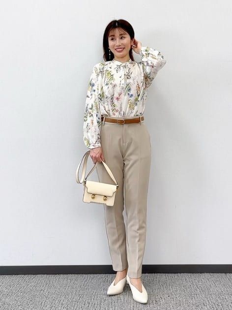 軽やかな春のムード漂う、ニュアンスカラーのワントーンコーデ。ベージュ系のチョイスでも美シルエットを約束してくれる間違いないパンツです。上は華やかなフラワープリントのブラウスで女性らしいエレガントさをプラス。小物もアイボリーでまとめることで、全体を柔らかな印象に仕上げました。オフィスシーンにはもちろん、子どもの行事やランチ会など、さりげなく華やかさを演出したいときにもぴったりなスタイル。