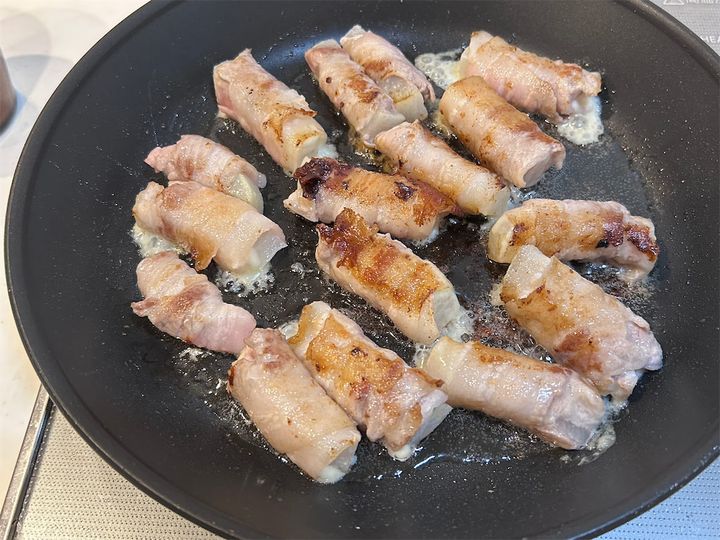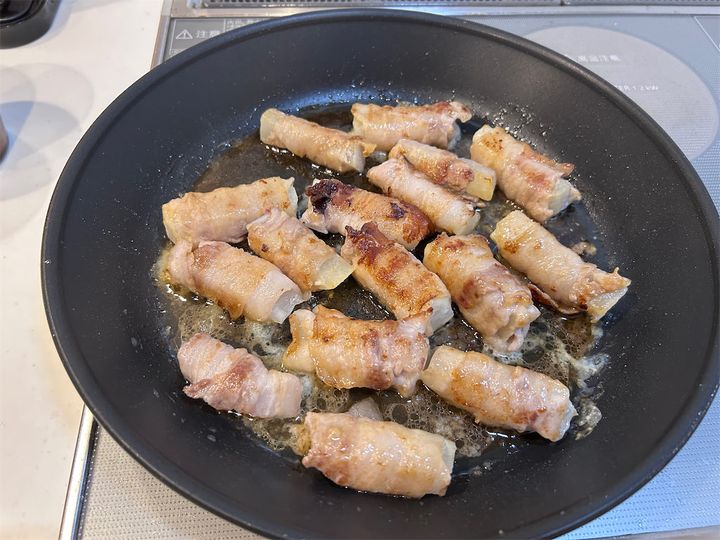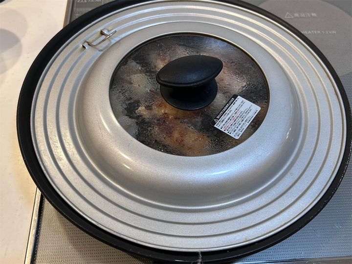 フライパンが温まったら、6を並べ入れて加熱します。加熱時間は中火で4分+弱火で1分ほどでした。