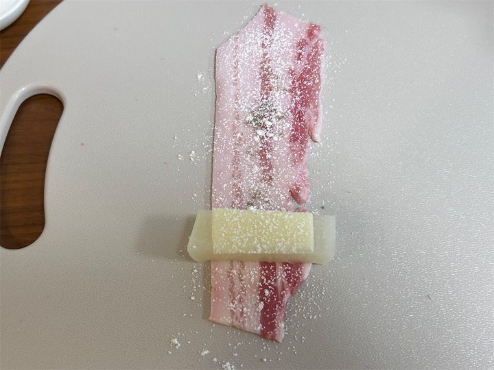 6.それではいよいよ大根とチーズを巻いていきましょう!4の豚肉に塩、こしょうをまぶします。
