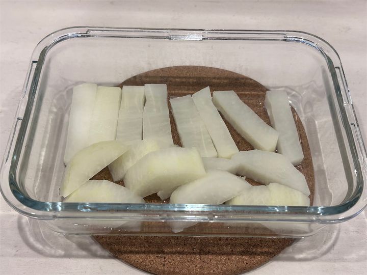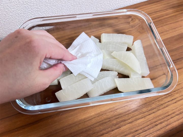 5.10分ほど経ったところで大根の粗熱が取れたので、キッチンペーパーで水気を吸い取ります。