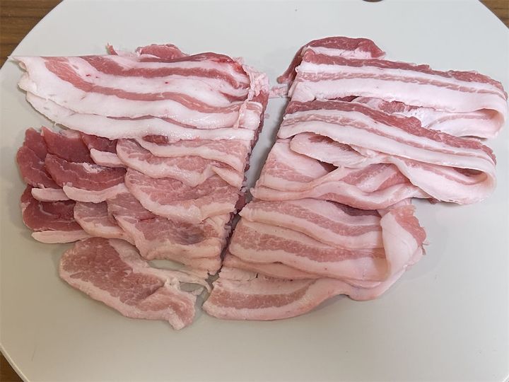 4.豚肉も半分に切っておきます。8枚のお肉を半分に切って、16枚にします。