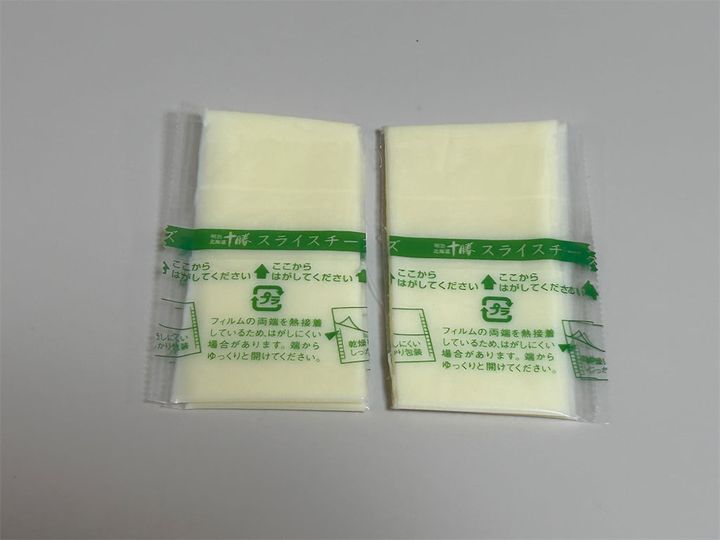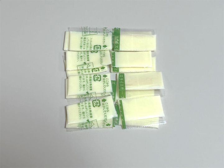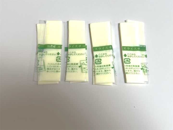 スライスチーズは、フィルムで包装された状態のまま切るのがポイント。とても切りやすくなります!