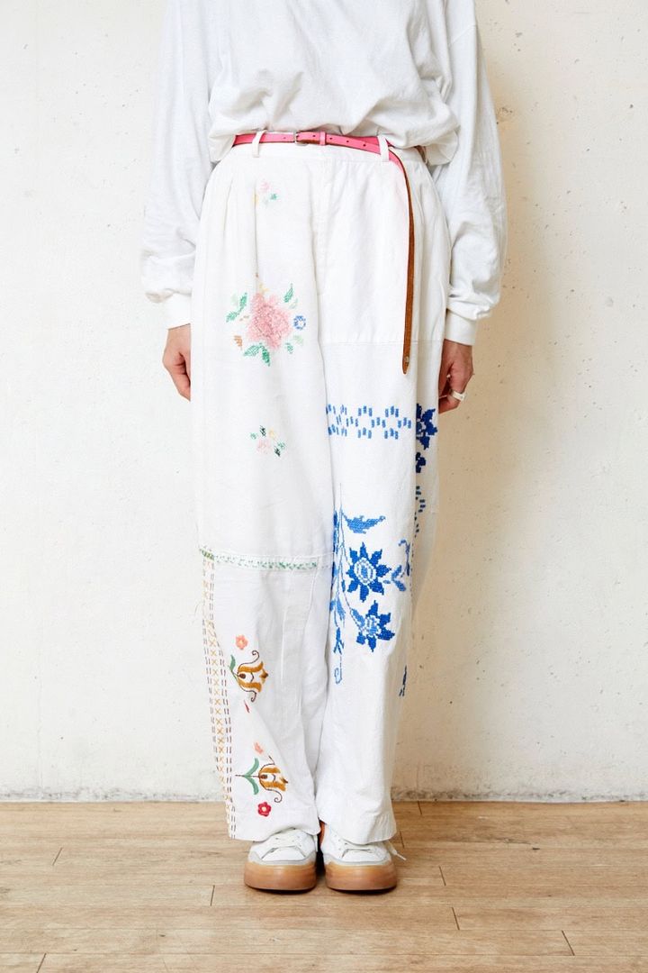 テーブルクロスをリメイクしたパンツは、繊細な刺しゅうの風合いが魅力。ピンクのベルトを投入することでコントラストをつけ、さりげなくメリハリもプラス。