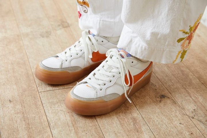 オレンジのスウッシュが効いたNIKEのスニーカー。ナチュラルでさわやかな色合いとガムソールが着こなしにこなれ感を加味。