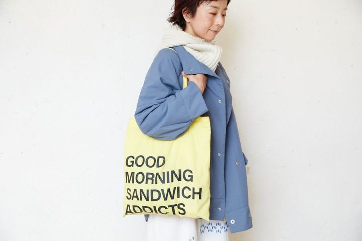 「トートバッグは東京・下北沢のサンドイッチ屋“サンドイッチクラブ”のもの。お店自体も素敵で、色味と大きく文字が入ったデザインがお気に入り」
