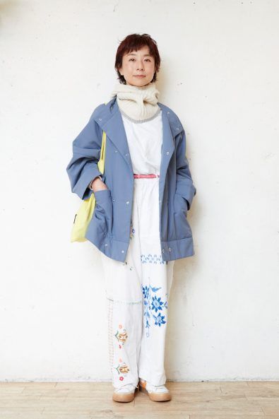 「ベースの白が全体を繋ぎ、キレイ色が映え、さまざまな色を使っていてもバランスよくまとまります。コートは、軽くてあたたかく、ゆったりとしたシルエットや、日常になじむブルーの色味もお気に入りです」
