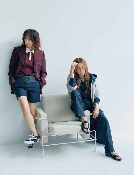 [SERI]コート¥869,000、ポロシャツ¥170,500、パンツ¥176,000、シューズ¥134,200※全て予定価格(全てミュウミュウ/ミュウミュウ クライアントサービス)、[MAYUMI]ジャケット¥544,500、ポロシャツ¥162,800、ショートパンツ¥330,000、シューズ¥151,800