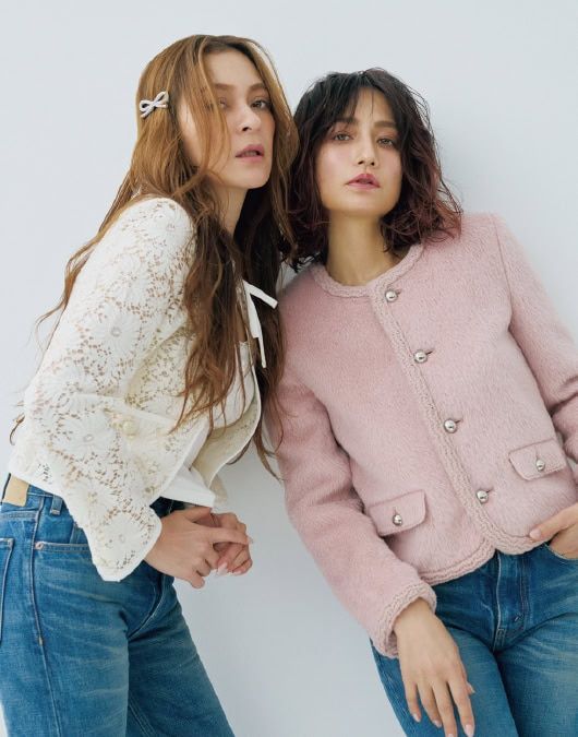 [MAYUMI]ジャケット¥517,000、デニムパンツ¥154,000※共に予定価格、[SERI]ジャケット¥517,000、トップス¥115,500、デニムパンツ¥154,000※全て予定価格、ヘアピン※参考商品(全てセリーヌ バイ エディ・スリマン/セリーヌ ジャパン)
