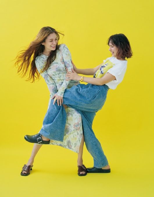 [MAYUMI]Tシャツ¥112,200、デニムパンツ¥189,200、ブレスレット¥210,100、シューズ¥162,800、[SERI]ドレス¥223,300、シューズ¥155,100、リング¥122,100※全て予定価格(全てロエベ/ロエベ ジャパン クライアントサービス)