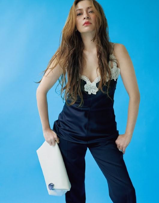トップス¥283,800、パンツ¥269,500、ゴールドリング¥62,700、シルバーリング¥88,000、バッグ¥379,500(全てジル サンダー バイ ルーシー アンド ルーク・メイヤー/ジルサンダージャパン)