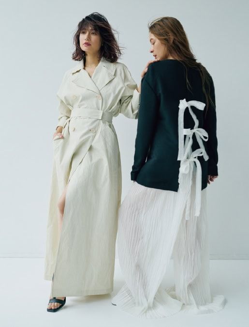 [SERI]トップス¥569,800、パンツ¥336,600、シューズ¥160,600(全てザ・ロウ/ザ・ロウ・ジャパン) [MAYUMI]コート¥433,400、シューズ¥156,200※参考商品(共にマックスマーラ/マックスマーラ ジャパン)