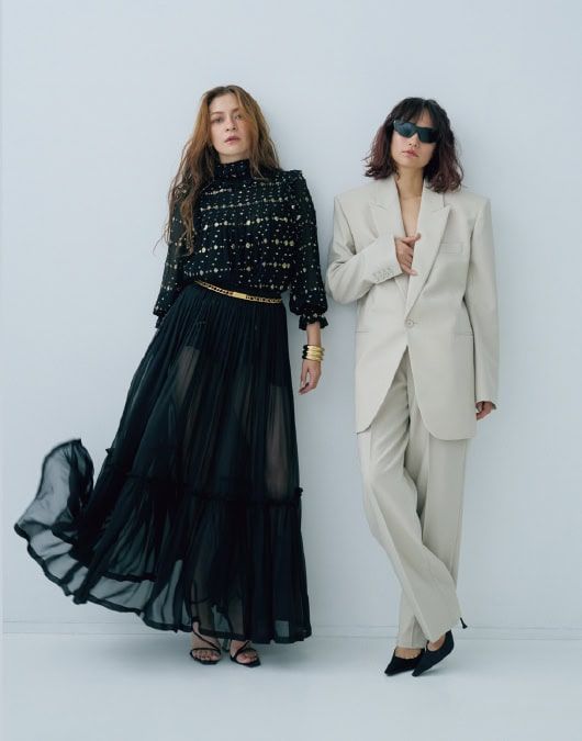 [MAYUMI]ジャケット¥528,000、パンツ¥283,800、サングラス¥69,300、シューズ¥181,500、[SERI]トップス¥544,500、スカート¥594,000、ベルト¥159,500、ブレスレット¥145,200、シューズ¥181,500(全てサンローラン バイ アンソニー・ヴァカレロ/サンローラン クライアントサービス)