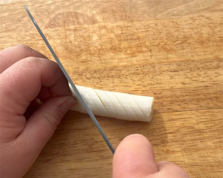 上のように、長ねぎの両面に斜めの切り込みを入れていきます。
