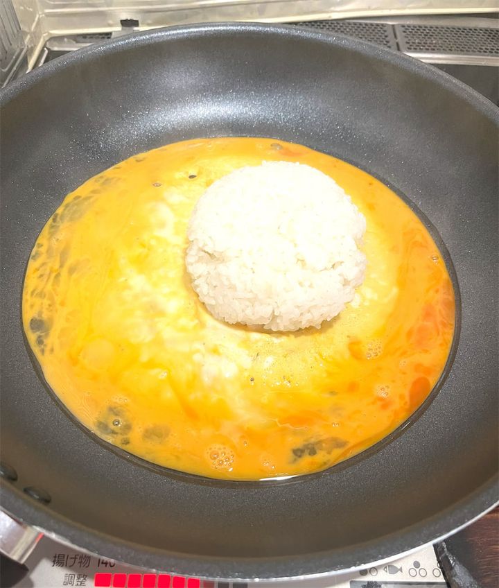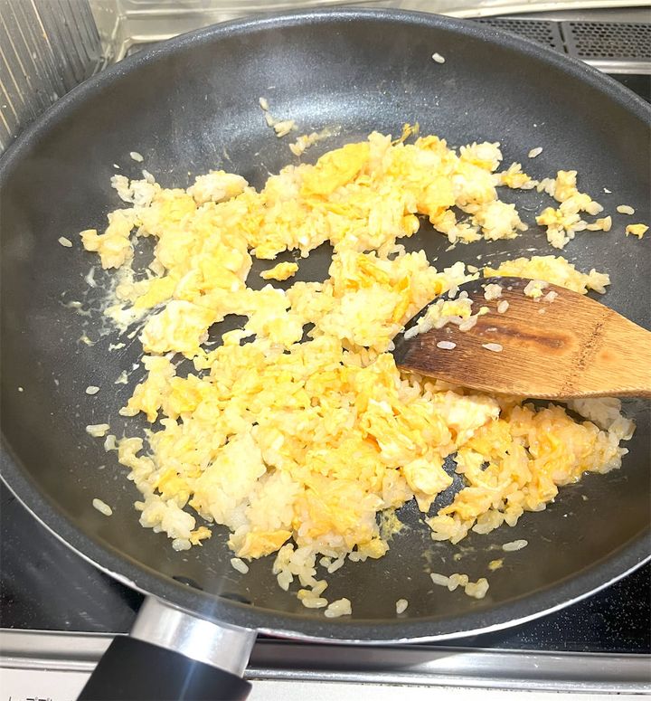 フライパンが温まったところで、溶き卵とご飯を順番に入れて、手早く炒めます。