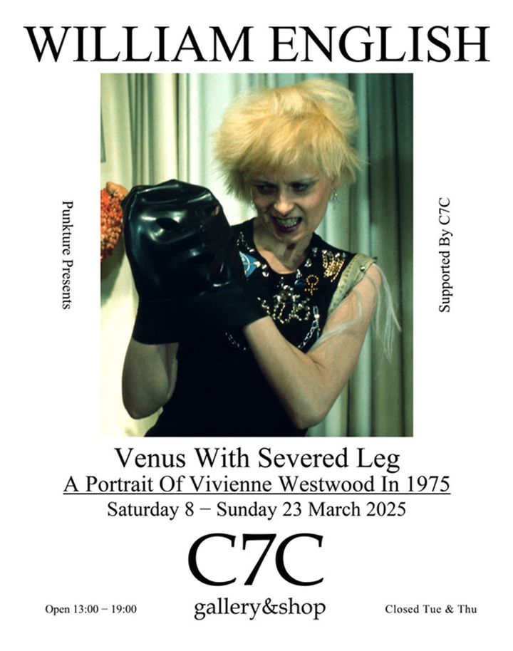 イギリスの映像作家、写真家 William Englishの写真展「Venus With Severed Leg A Portrait Of Vivienne Westwood In 1975」が、名古屋のC7C gallery and shopにて3月23日(日)まで開催中。1951年、イギリスに生まれたWilliam Englishは、ロンドン映画学校で映画制作を学び、多くの実験的なフィルムを手がけたことで知られている。本展は、昨年末に原宿gallery PUNKTUREにて好評を得た展示の巡回展。Williamが、パンク誕生前夜の1975年にファッションデザイナー Vivienne Westwoodを撮影した作品を中心に展示、販売する。