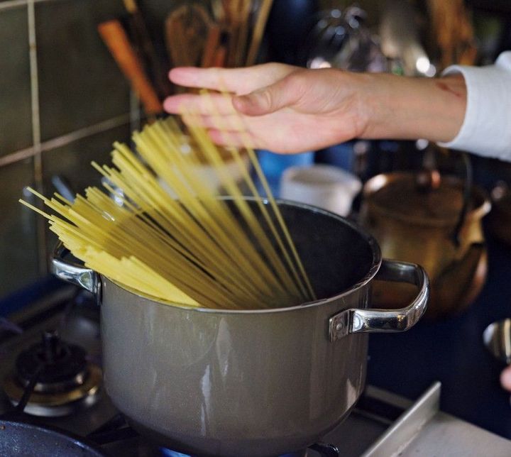 パスタをゆでるときは、湯に対して1%くらいの塩の量が一般的。ですが、今回のレシピでは、多めのゆで汁をソースとしてパスタに煮からめるので、ちょっと控えめな0.6~0.7%で。湯1.5リットルに対して塩小さじ2弱がこの量です。