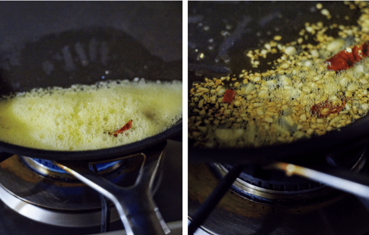 フライパンを傾け、たまった油で揚げるようにしてにんにくを熱して。初めはシュワシュワ―ッと泡立ちますが、しばらくすると泡が落ち着き、にんにくがこんがりと色づきはじめます。これが、水分が抜け、香りがオリーブオイルにしっかり移った証。ここは慌てず、じっくり待って。