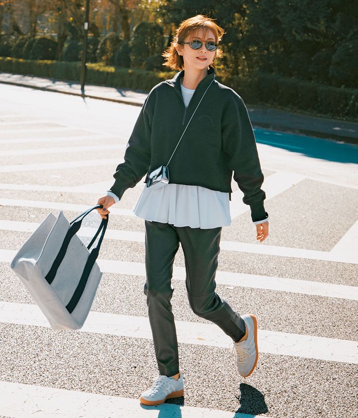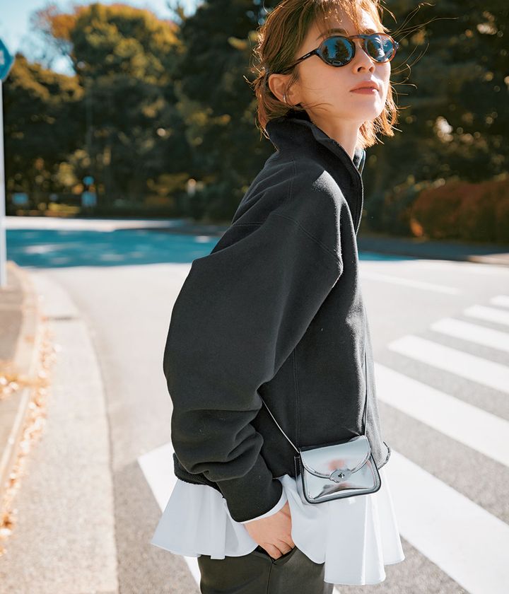 スウェット¥27,500(サードマガジン)ブラウス¥38,500(デパリエ/デパリエ 伊勢丹新宿店)パンツ¥154,000(エステータ/オンワード樫山 お客様相談室)ショルダーバッグ¥74,800(マルベリー/マルベリージャパン)トートバッグ¥37,950(フランソワ レニエ/ヤマニ)シューズ¥15,400(アディダス/アディダスお客様窓口)サングラス¥55,660(ジョルジオ アルマーニ/ルックスオティカジャパン カスタマーサービス)イヤーカフ¥11,000(ete bijoux)