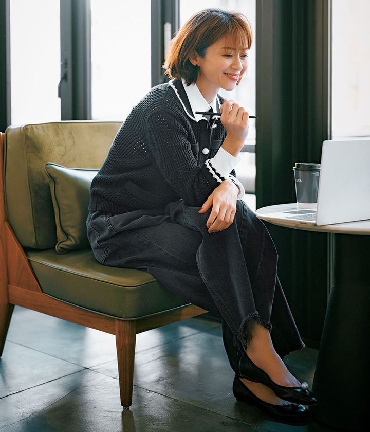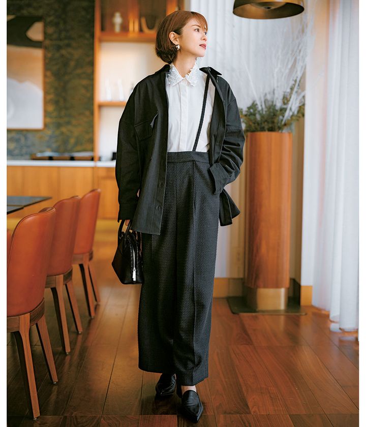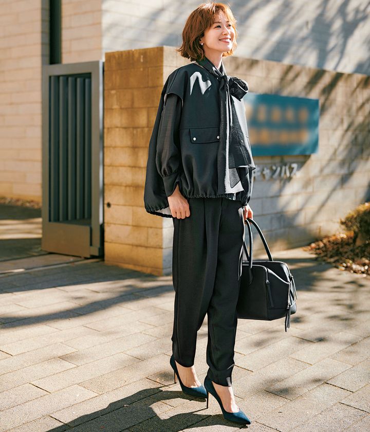 トップス¥53,900(マディソンブルー)ジャケット¥31,900(FRAY I.D/FRY I.D ルミネ新宿2店)パンツ¥55,000(ラインヴァンド/ラインヴァンド カスタマーサポート)バッグ¥14,300(ツル バイ マリコ オイカワ)パンプス¥49,500(イロット/ザ・ウォール ショールーム)ピアス¥24,200(Jouete)ネックレス¥20,900(マユ/マユ ショールーム)