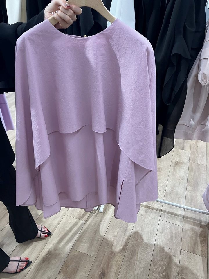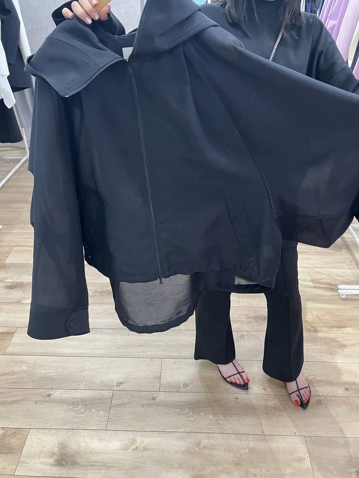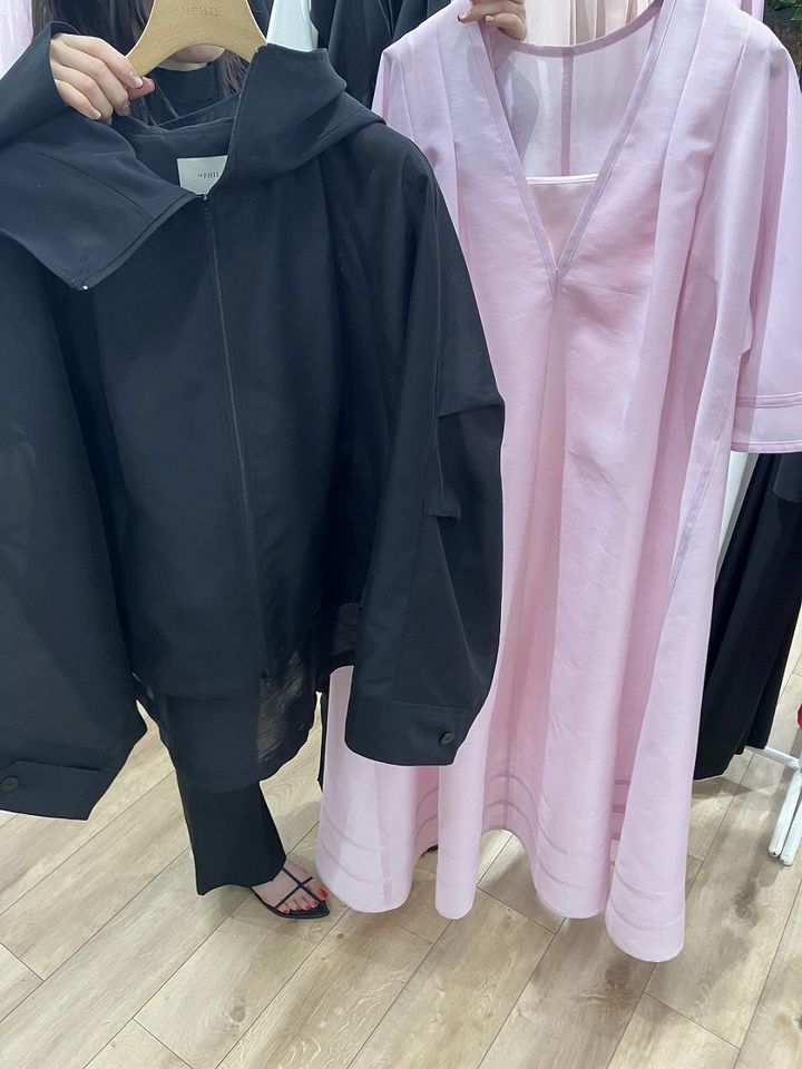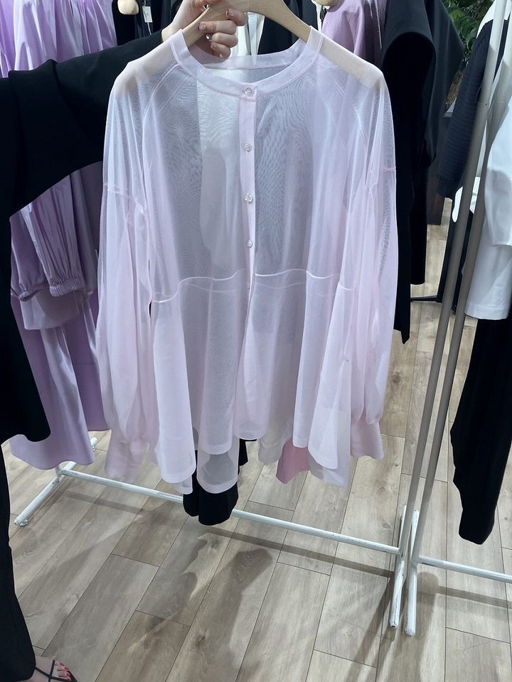 シアーなフード付きアウターは、着るだけでオシャレな雰囲気に。スモーキーなピンクのシアーなブラウスもカーディガンも素敵でした!
