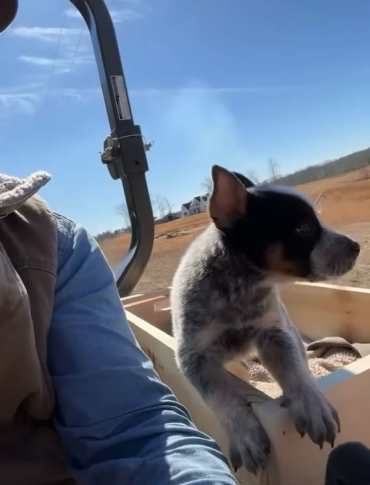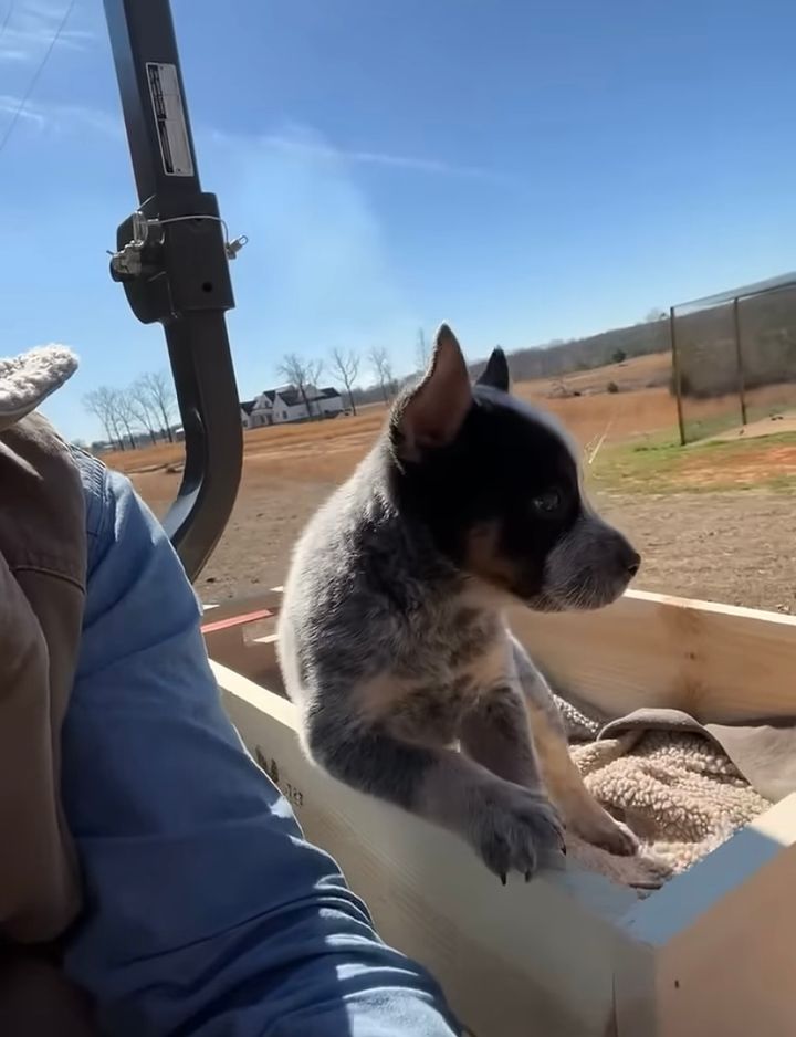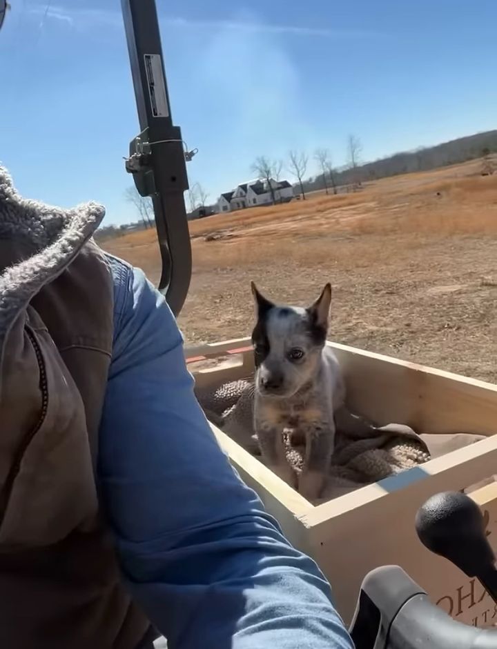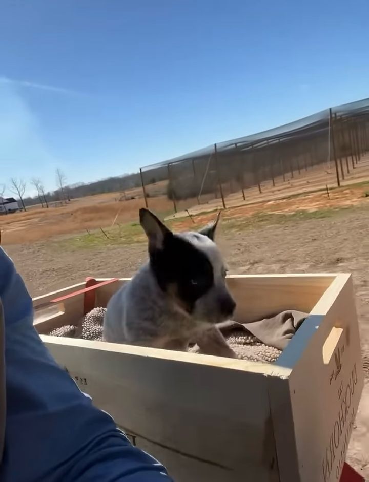 男性が運転するトラクターに乗っていたのは、木箱に入ったブルーヒーラーの子犬でした。
