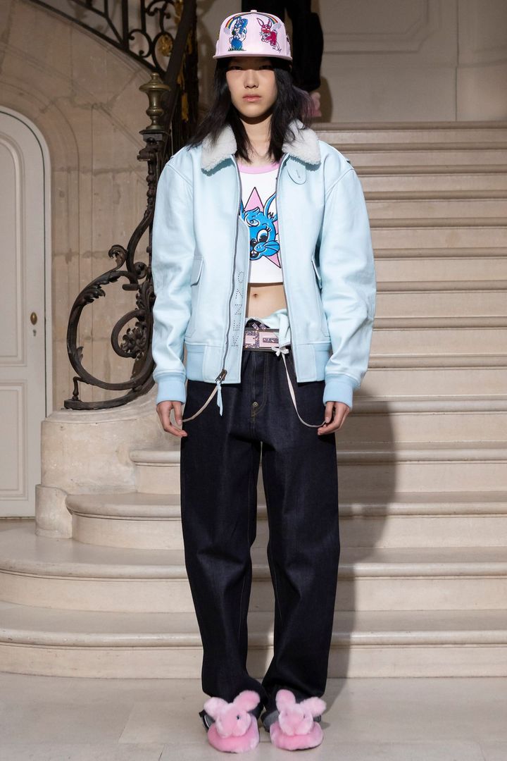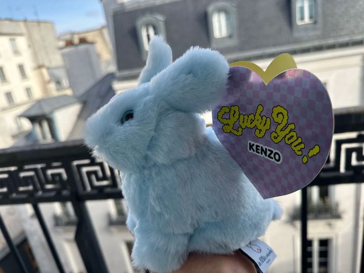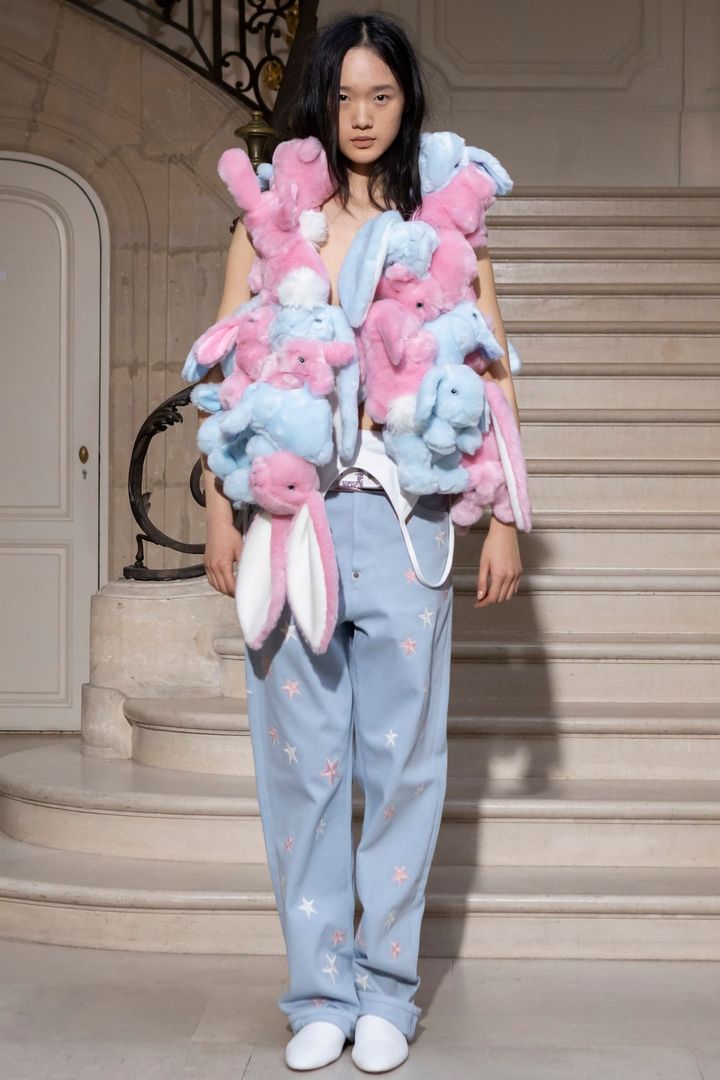招待状はベビーブルーのウサギのぬいぐるみ。これは、フランスの老舗ぬいぐるみブランド「ラ プルシュリー(La Pelucherie)」とのコラボレーションによるもので、耳には、英語で「運がいいですね」を意味する“Lucky You!”というタグがつけられていた。ぬいぐるみは2色展開で、ブルーのほかに、「私は運がいい?」というようなニュアンスになる“Lucky Me?”と名付けられたパウダーピンクのウサギも登場。ショーでは、ぬいぐるみを縫い合わせたトップスやシューズ、スカーフなど、ユニークなアイテムがラインナップされていた。