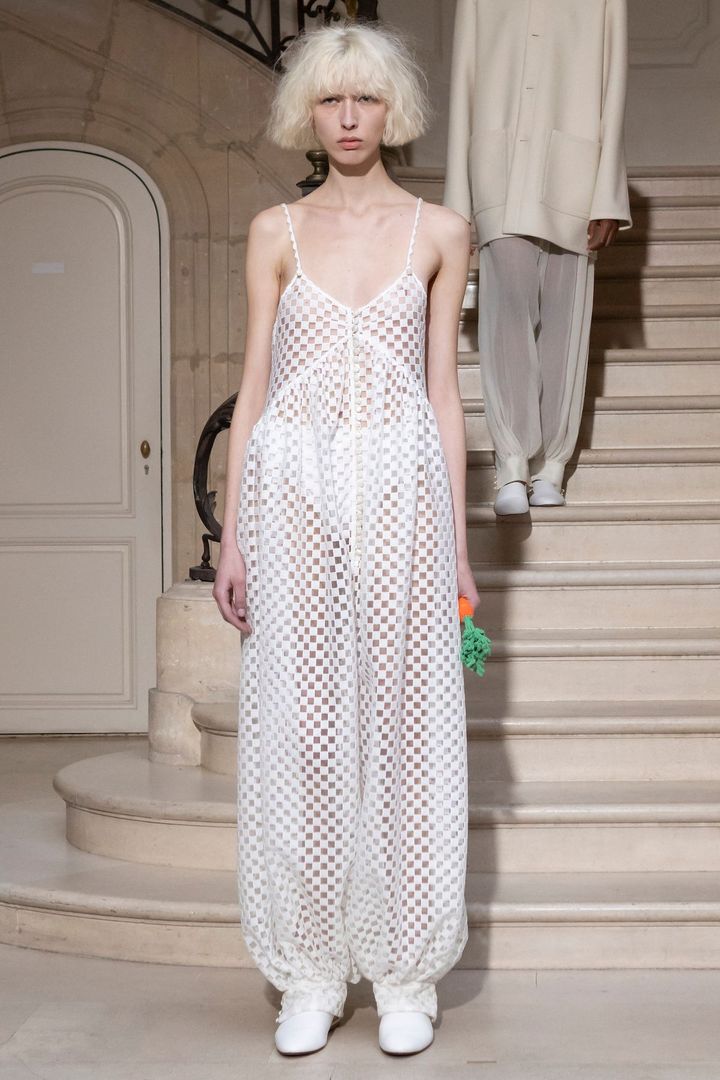 市松模様のレースは、1990年代のケンゾーダミエをアレンジしたもの。ウサギの大好物であるニンジンを持ったモデルたちがキュートな印象を与える。序盤では、マスキュリンなアイテムをフェミニンにアレンジし、ゆったりとしたボーイフレンドフィットが特徴的だ。