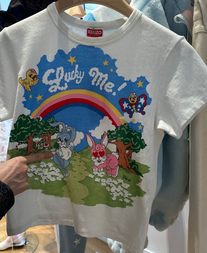Tシャツなどに描かれたグラフィックからは、ピンクの雄ウサギの“Lucky Me?”がブルーの雌ウサギの“Lucky You!”に恋をするというラブストーリーが垣間見え、木の影からはブランドアイコンのタイガーが覗いている。この物語は来シーズンの2026年春夏コレクションにつながっていくという。