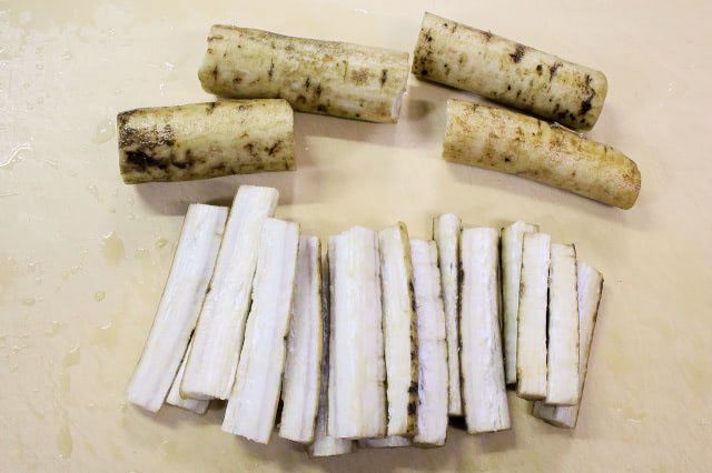 1. ごぼうの泥をきれいに洗い流し、4~5cm長さにしてから縦4等分に切ります。