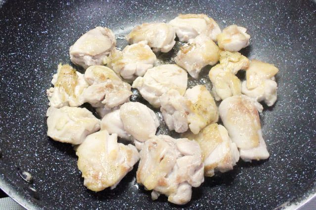 4. フライパンに油(大さじ1)を引き、強めの中火で熱します。皮目を下にして鶏肉を並べ、皮にしっかりと焼き色が付くまで焼きましょう。焼き色がついたら鶏肉をひっくり返し、反対の面は色が変わる程度に焼きます。