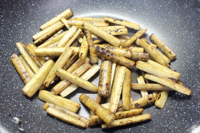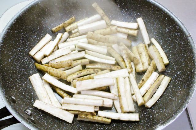 3. フライパンに油(大さじ2程度)を引き、強めの中火で熱します。ごぼうを入れたら全体に油を絡めて広げ、焦げるくらいまで焼き色を付けます。