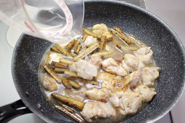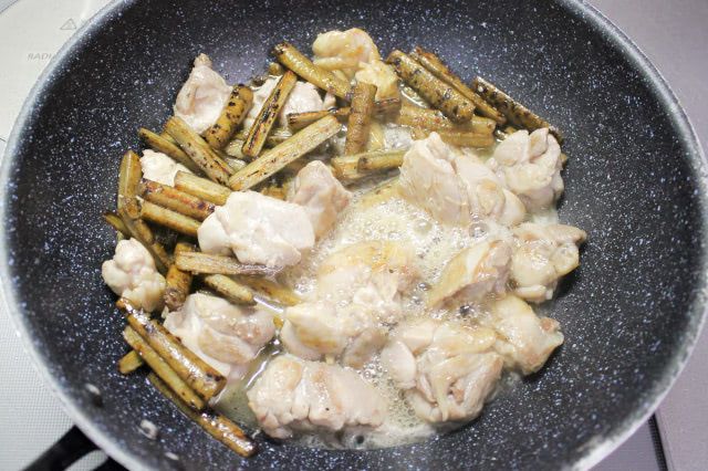ごぼうに食感があるので、鶏肉は硬くならないよう、身側は色が変わる程度に焼きます。今回は2分ほど焼きました。