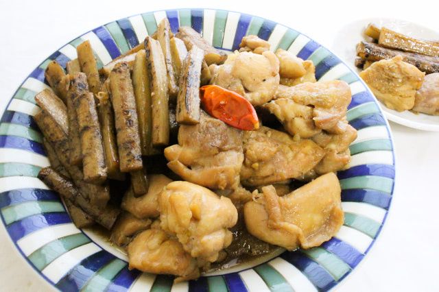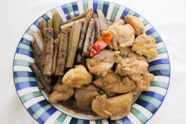 ごぼうと鶏肉をしょうゆベースの煮汁で煮たので、全体が茶色で地味な煮物になっていますね。ごぼうのいい香りが、ほんのりとしていますよ。
