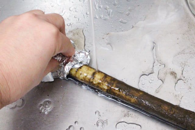 洗いごぼうは乾燥しやすいので、泥付きのごぼうを使うのがおすすめです。泥はアルミホイルでこすって、きれいに落としました。