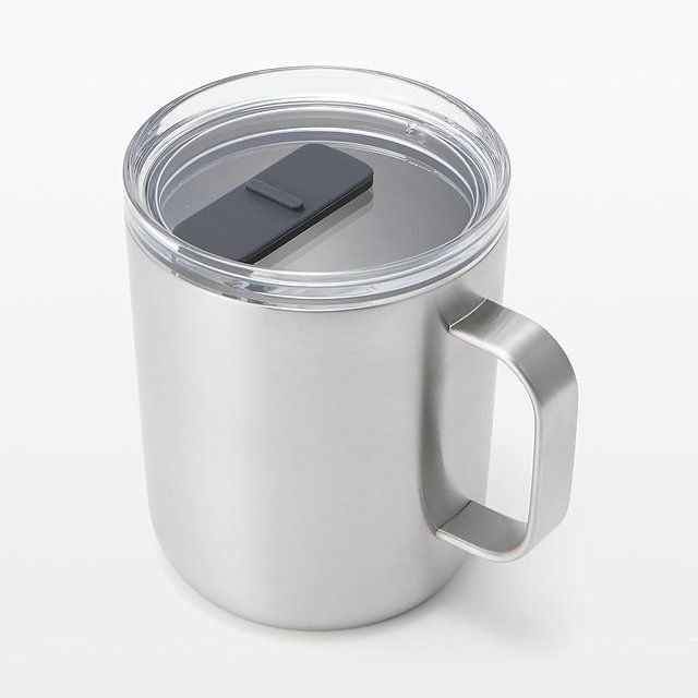 保冷保温ができる真空断熱二重構造のステンレス製マグカップ。外側は結露が起きにくく、熱くなりにくい仕様。即席スープや粉末飲料が飲みやすい目盛り付き。スライド付きの蓋がセットになっているのも嬉しいポイント。