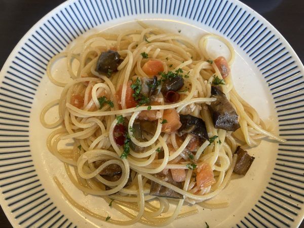 今回注文したのは揚げナス、フレッシュトマトとアンチョビのパスタ。パスタにはコシがあり食べ応えがあります。トロンと揚がったナスがニンニクやオリーブオイルと絡み合って美味しい。フレッシュトマトがいい酸味を加えています。温かい家庭的な味のパスタです。