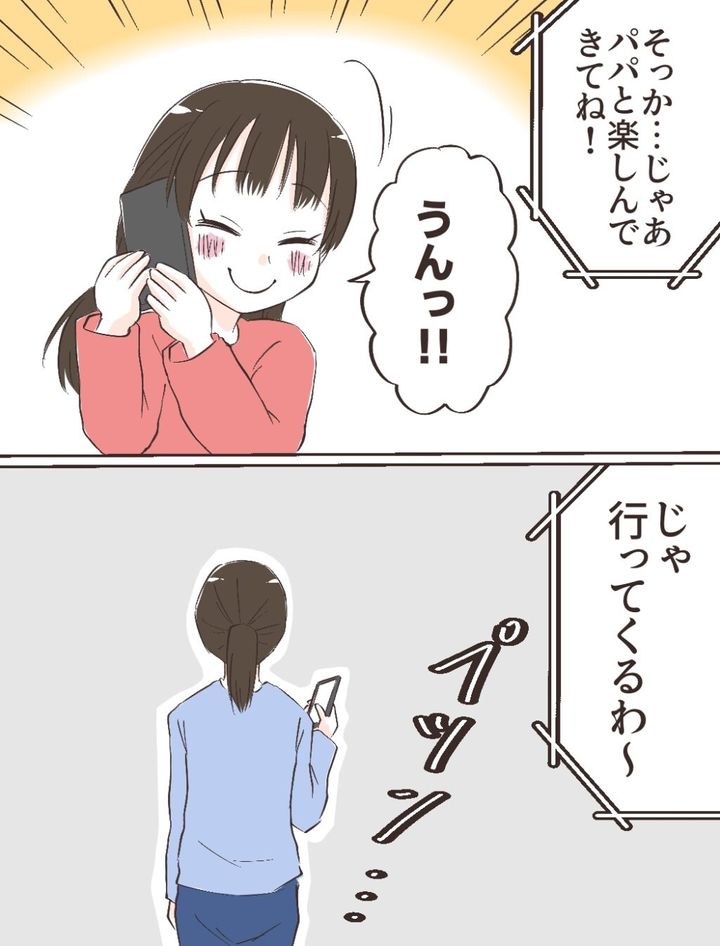 「そっか。じゃあパパと楽しんできてね!」と言うと、「うんっ!」リナは元気よく返事をしました。夫に「じゃ、行ってくるわ~」と言って電話を切られたあと、私はしばらくその場に呆然と立ち尽くすのでした。