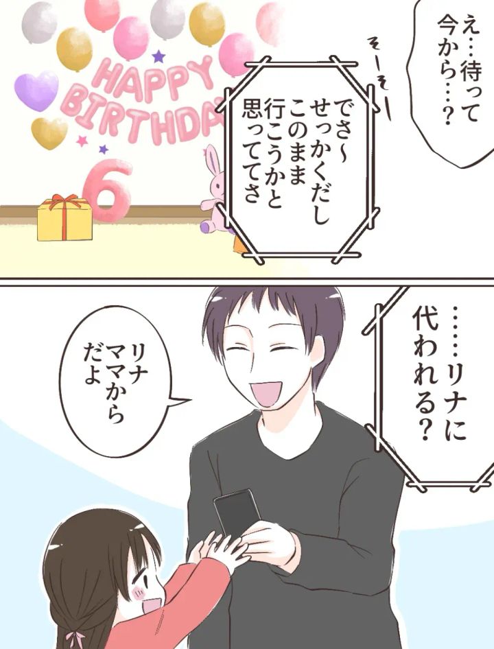「え、待って今から?」夫のことばが信じられず確認してしまった私。だって、私今何しているか知ってるよね?家族で祝うリナの誕生日会の準備をしているのよ?それでも夫は「せっかくだしこのまま行こうかと思っててさ。」と言うのです。