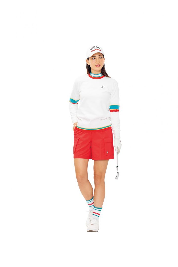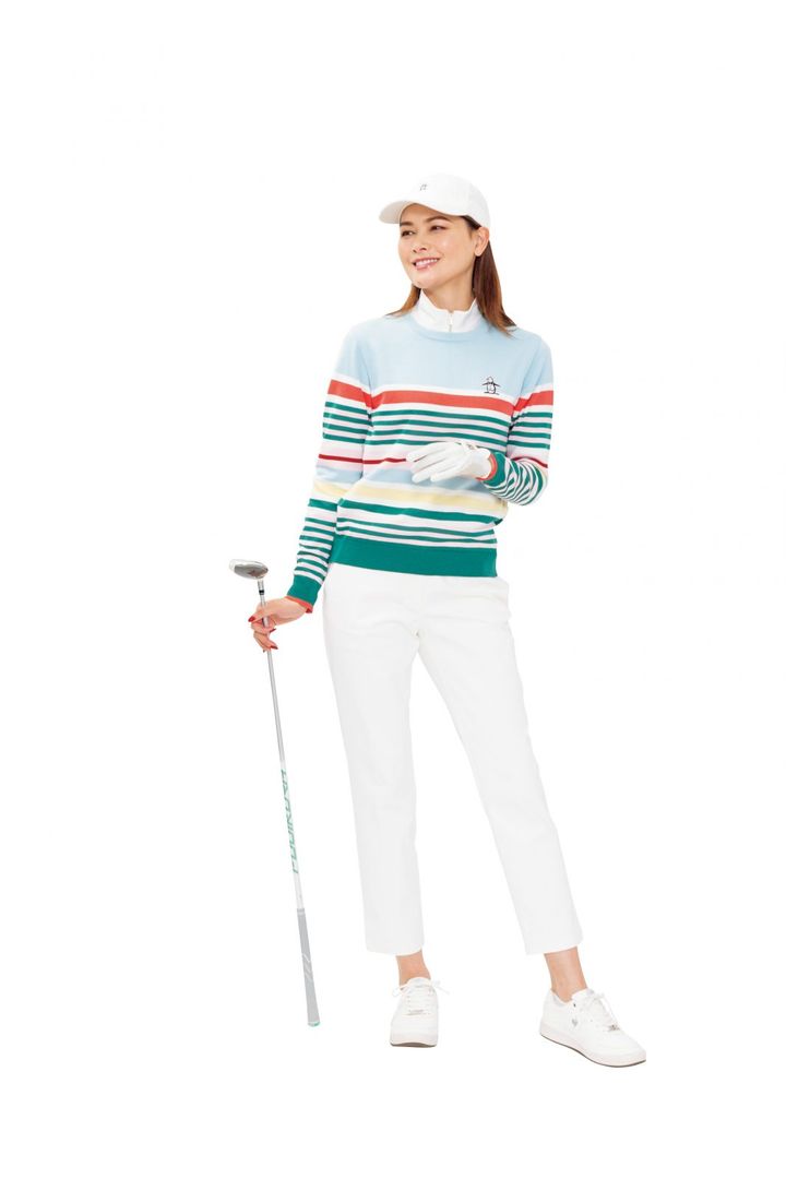 ニットで作る正統派スタイルこそ、旬のカラーやデザインに頼った、ネオトラッドに更新を。BIGなペンギンロゴを施した、ハッピーなムードのカラフルなニットに、美脚ラインをメイクするクロップド丈の白パンツが好相性。キャップ5,500円、ニット24,200円、ジップアップシャツ19,800円、パンツ25,300円(すべてデサントジャパンお客様相談室)、その他 スタイリスト私物