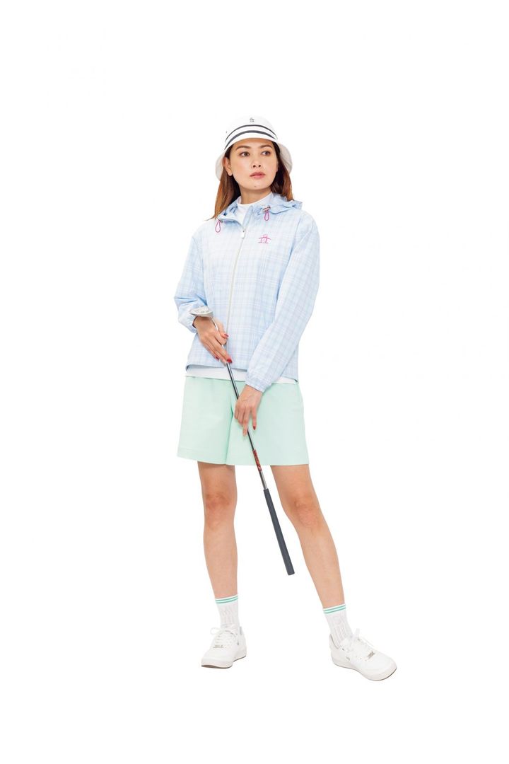 端境期に役立つ軽やかなブルゾン×強ストレッチのショーパンの、アクティブなルック。春らしいパステルトーンを組み合わせれば、スポーティなアイテム同士でも女らしさが際立って、ちょうどいいバランスに。ハット7,480円、ブルゾン33,000円、モックネックシャツ17,600円、ショーツ22,000円、ソックス2,860円(すべてデサントジャパンお客様相談室)、その他 スタイリスト私物