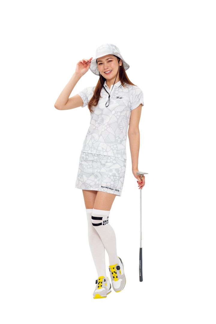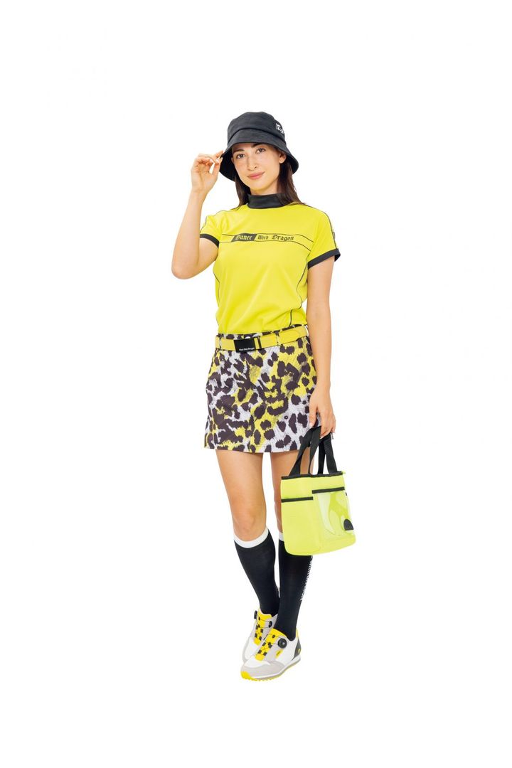 モノトーンに鮮やかなイエローをきかせた、ブランドらしい大胆なモノグラム柄の楽しいムード漂うセットアップ。バイザー11,000円、ブルゾン47,300円、モックネックシャツ25,300円、スカパン36,300円、ニーハイソックス3,960円、シューズ44,000円、カートバッグ19,800円(すべてウィッツ)。