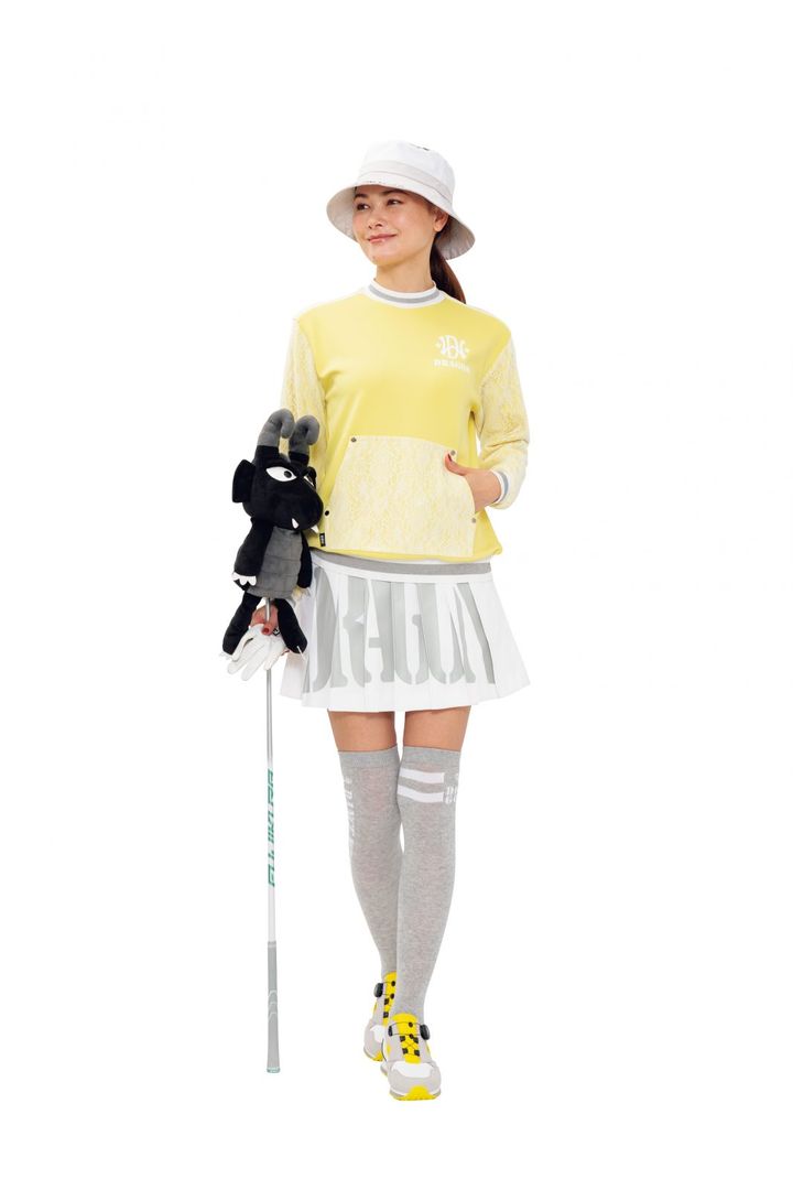 スウェット感覚でリラクシーなトップスに合わせた、プリーツスカートの大胆なBIGロゴに注目が集まりそう。淡いイエロー×グレーを組み合わせた、春らしいカラーコーデが可愛さを後押しする。ハット15,400円、トップス39,600円、スカート37,400円、ニーハイソックス3,960円、シューズ44,000円、ヘッドカバー[FW]26,400円(すべてウィッツ)、その他スタイリスト私物。