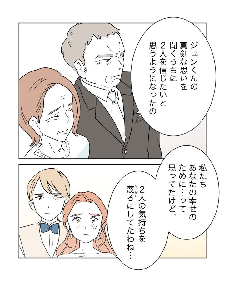 「ジュンくんの真剣な思いを聞くうちに2人を信じたいと思うようになったの。私たち、あなたの幸せのために・・って思ってたけど、2人の気持ちを蔑ろにしてたわね・・」と、私の幸せを思うあまり2人の気持ちを考えられていなかったと母は反省していました。
