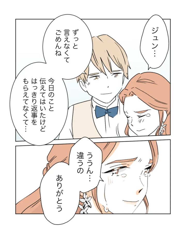 「ずっと言えなくてごめんね。今日のこと伝えてはいたけどはっきり返事をもらえてなくて・・」と両親が来ることを黙っていたことを謝るジュンに私は「ありがとう」と言いました。