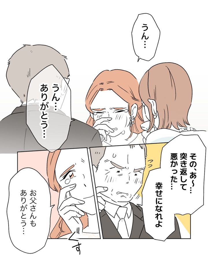 「うん・・うん・・ありがとう」涙が止まらない私に父も「その、あ~・・突き返して悪かった・・幸せになれよ」と照れくさそうに言ってくれました。