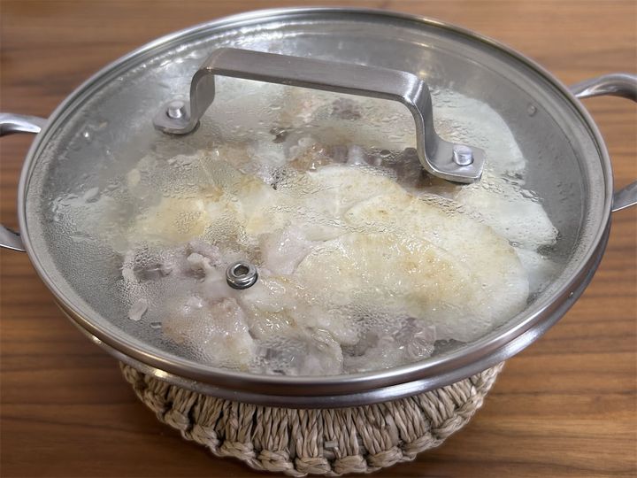 4.3に具材の上からほんだし®、昆布だし、塩、水を振りかけます。