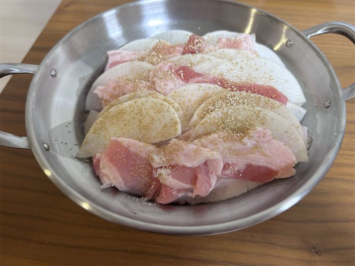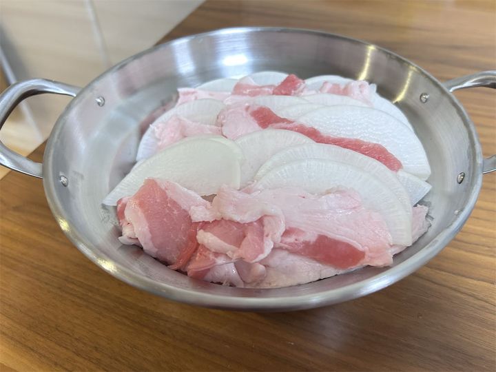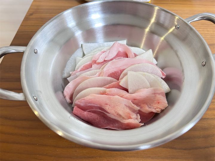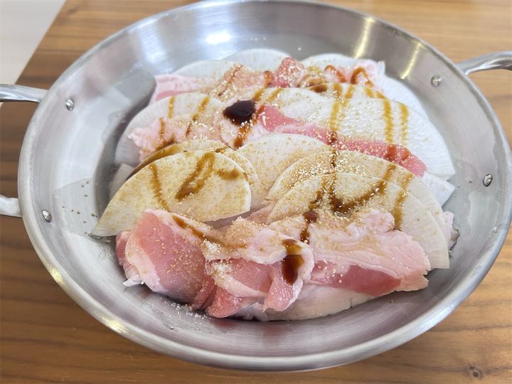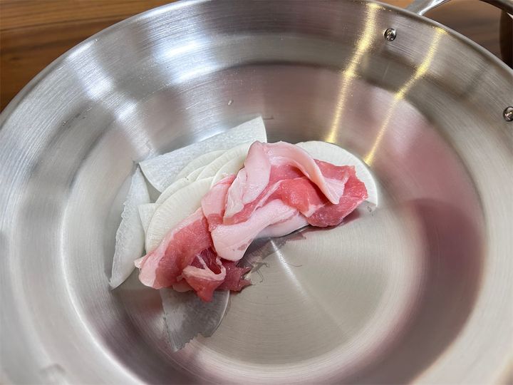 3.鍋に1の大根と2の豚肉を交互に重ねて入れていきます。